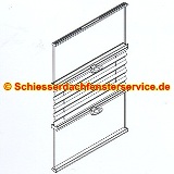 DB 20 U, Verspannte Anlage für rechteckige Wohnraumdachflächenfenster, Flügelneigung max. 60° Behang aus Polyester-Gewebe, plissiert, dauerhaft stabile Falten in 25 mm Faltenbreite für Duette, befestigt an der Oberschiene. Wie Typ DB 10, jedoch Stoff durch zwei Bedienungsschienen frei vor dem Fenster positionierbar, z.B. zum Beschatten von Bildschirmarbeitsplätzen. Maße der Bedienungsschienen: 22 mm Tiefe, 20 mm Höhe Maße der Spannschiene: 18 mm Tiefe, 9 mm Höhe.