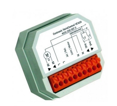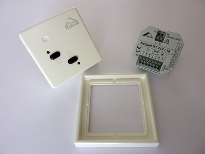 Trafo zwischen 230 V Netzspannung und 24 V Niederspannung. Bedienung über integrierte Taster Auf/Zu